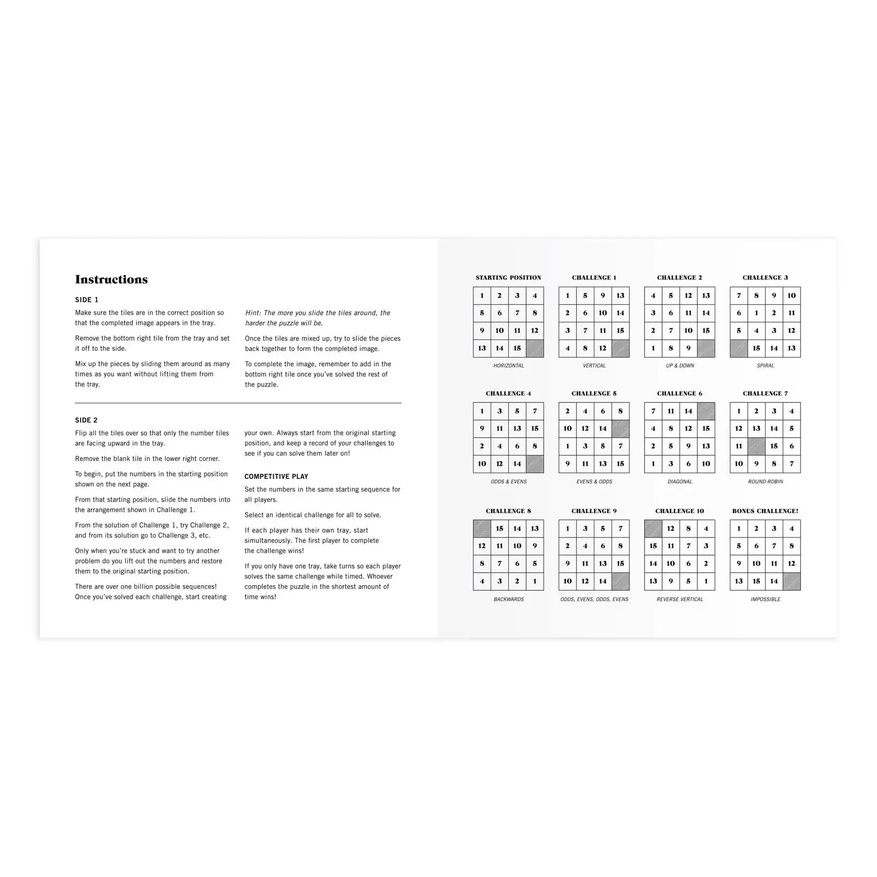 The Andy Warhol Marilyn 2-in-1 Sliding Wood Puzzle includes both a puzzle and a game. Side 1 is a wood tile puzzle featuring Warhol’s iconic Marilyn art. Side 2 is a numbers challenge known as “Game of Fifteen” where players slide the tiles (without lifting them off the surface) to match the multiple number sequence challenges provided on the instruction sheet. The tiles are only lifted up to move when the player is stuck and wants to revert to the starting configuration for a new challenge.