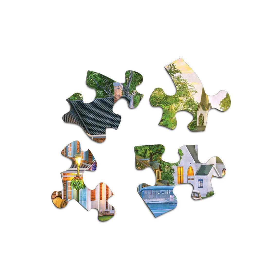 Wouldn't you agree? Each unique puzzle piece brings to life the old New England community so sweetly preserved just like a blue-ribbon jam. Colonial-style residences are tucked amongst historic trees, and a rain-washed street is aglow with lampposts. The magic of quintessential is perfectly illustrated in Blissful Borough.