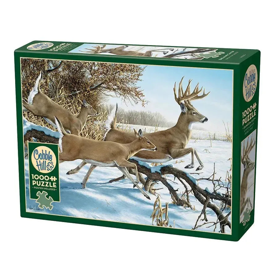 The white tailed deer are Breaking Cover as they hear the crackling of tree branches behind them. It's a tough call to run out into the open field, but they have to escape the snow covered forest before they become someone's prize for the winter. A heart pumping 1000 piece scenic wildlife puzzle.