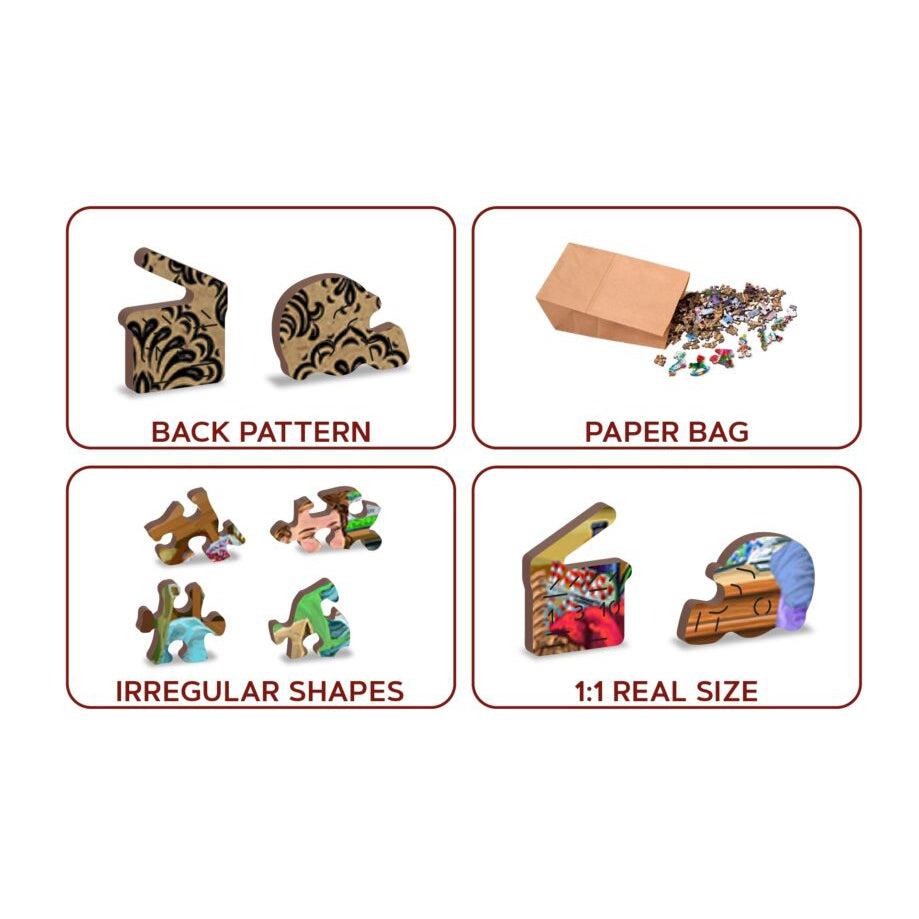 Each puzzle contains numerous unique shapes, characters, figures, and symbols that are cut seamlessly into the pattern. Think of these as mysterious little surprises each puzzle experience offers. These puzzles offer a high quality, rich beautiful image on the front and a detailed wallpaper style pattern on the back. Wooden City double-sided wooden puzzles offer a unique building experience that is sure to captivate puzzle enthusiasts of all ages.
