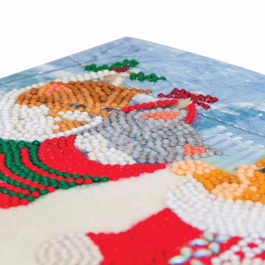 Crystal Art card kits are art and craft kits, ideal for children ages 8+ and adults, which enable you to make your own sparkly and good crystal cards. The technique is similar to painting by numbers. Each card design has a numbered, adhesive template. After adding some pink wax to the pick up tool (both included), simply lift up the colored crystals and place them on the corresponding numbered dots. They affix instantly. The technique is relaxing and therapeutic, and the result is a good piece of rhinestone art which you can gift to loved ones. Crystal Art card kits are also a great way of making DIY Christmas cards. Making a crystal card takes 45 minutes to 1 hour. This card is 18 x 18 cm / 7 x 7 inch in size.