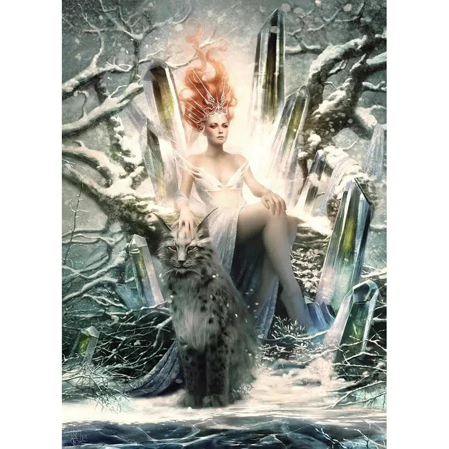 Crystal, the fairy queen, sits upon her icy throne petting her loyal lynx looking regal with her flowy ginger hair. This freezing cold fantasy puzzle is 1000 pieces of magical escapism and feminine power.