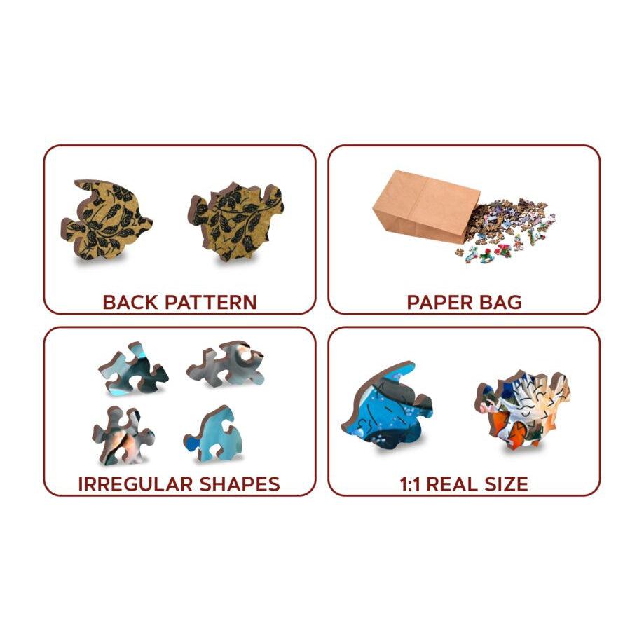 Each puzzle contains numerous unique shapes, characters, figures, and symbols that are cut seamlessly into the pattern. Think of these as mysterious little surprises each puzzle experience offers. These puzzles offer a high quality, rich beautiful image on the front and a detailed wallpaper style pattern on the back. Wooden City double-sided wooden puzzles offer a unique building experience that is sure to captivate puzzle enthusiasts of all ages.