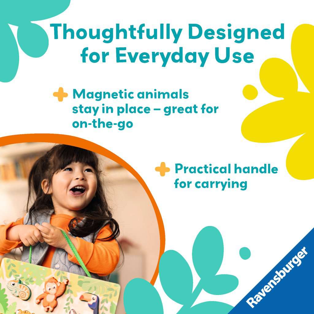 Get ready for jungle adventures with this colourful first wooden puzzle for little ones. Each of the six chunky wooden animals has their own place on the puzzle. In each one, there are fun textures to explore. Which animals can you spot in the jungle together? A great way to learn about first animals together. Once they’re placed in the right spot, the animals are secure in place thanks to a magnet, ideal for making sure that nothing gets lost in the toybox. As your little one grows, they can use each animal piece to stack a balance puzzle, encouraging physical development and dexterity. The practical handle makes the Wooden Touch & Play Puzzle fun for on-the-go and the cute animals can be used for story telling too. About Play+It all starts with play! A child's capacity to play is unlimited—and it's a good thing, too! The more your child plays, the more aware they become about how things work—sparking fun, discovery, and learning!The Play+ collection from Ravensburger encompasses a wide range of toys and books for babies and toddlers aged 0 to 36 months. With playful discovery at its heart, the collection has been designed keeping children and parents in mind - offering captivating fun and developmental benefits with practical touches for ease of use and added play value. Whether it's time for a story, teething time, an anytime playtime, or you're simply on-the-go together, Play+ toys and books are designed to encourage your child's natural curiosity and foster early milestones. Developed alongside experts and incorporating over 100 years of Ravensburger expertise in making high quality toys. It all starts with play!