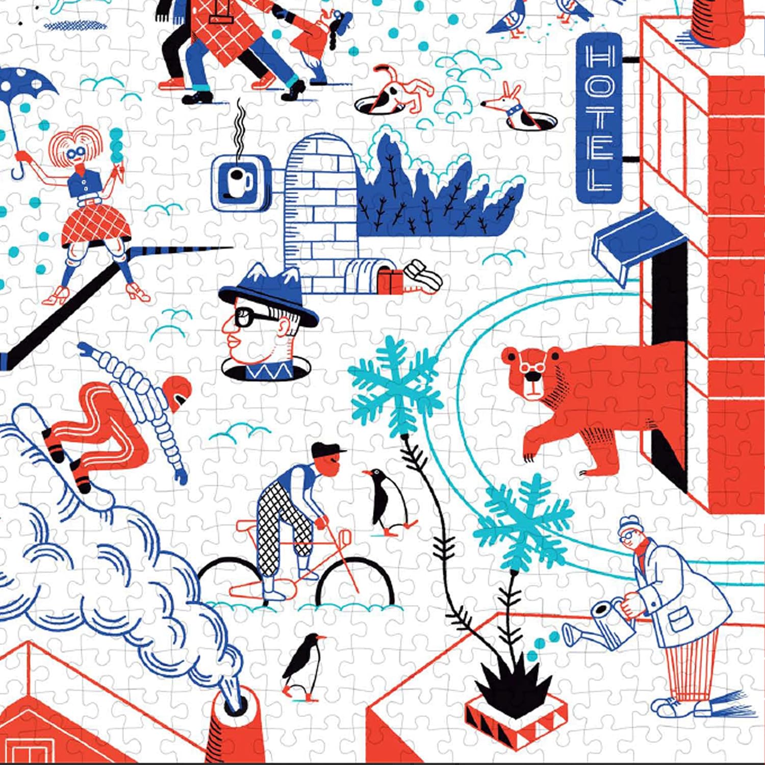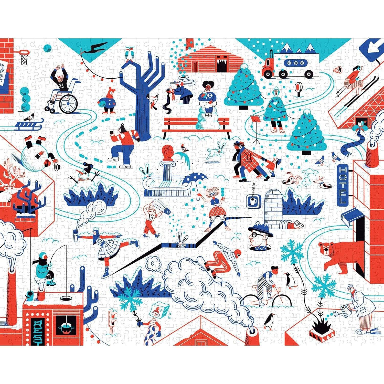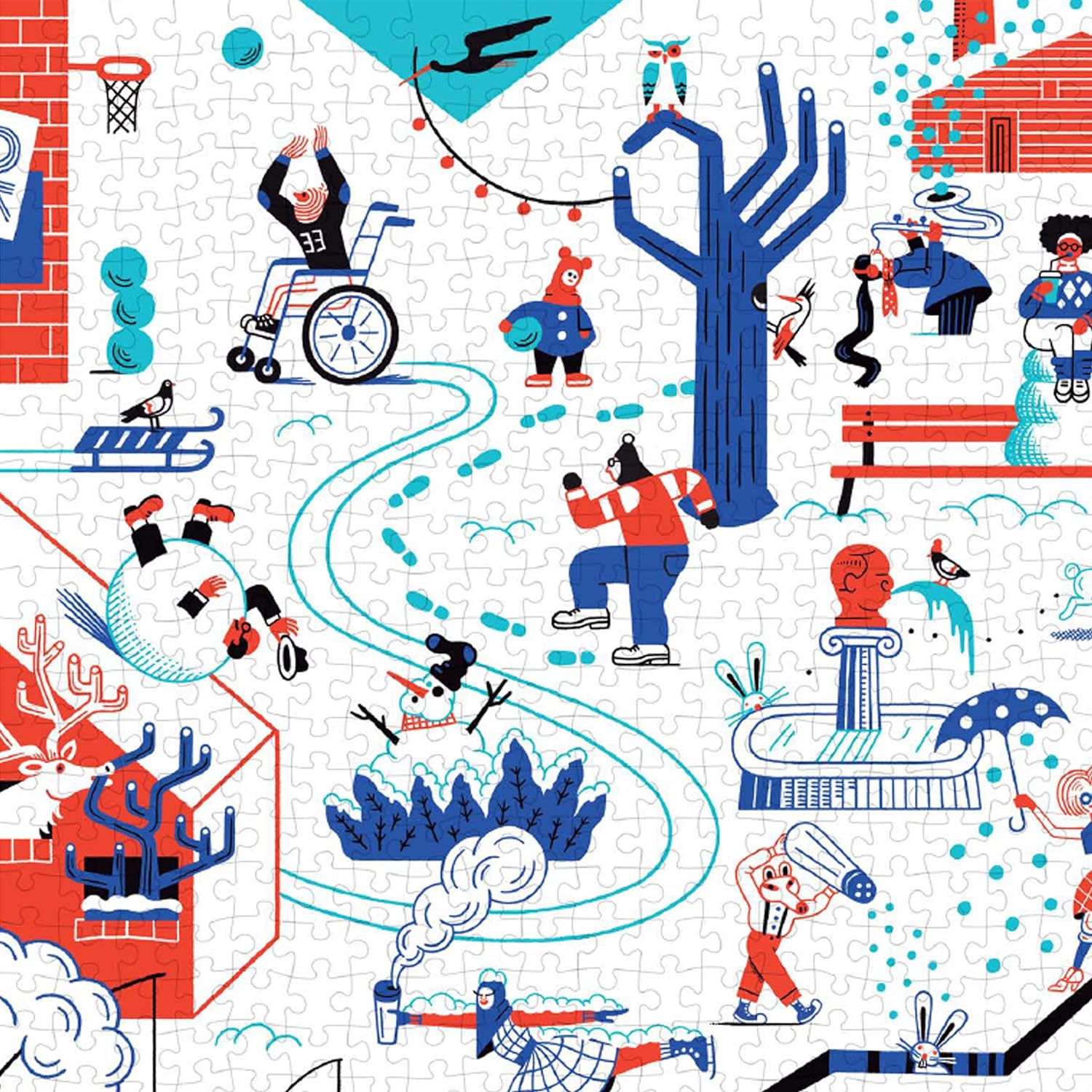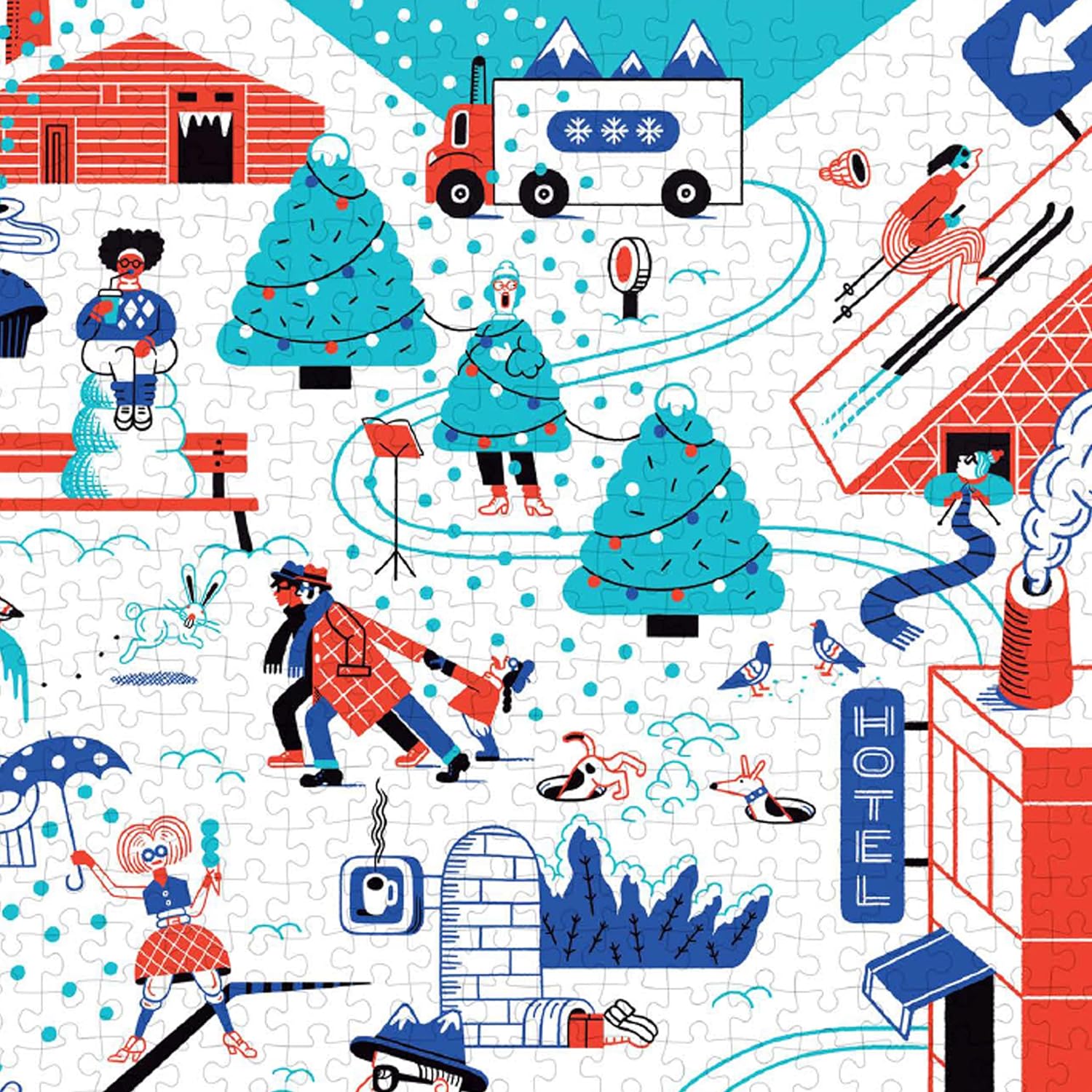 This joyful 1000-piece puzzle captures one moment in time on one perfect winter day. Packed with a quirky cast of characters, unexpected details, and tons of cold-weather humor, this puzzle is ideal to assemble during those chilly months of the year and makes the perfect holiday gift.