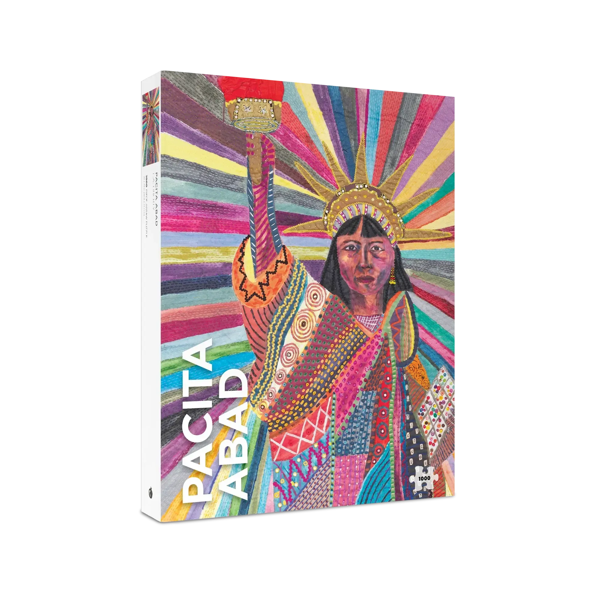 Draped in a cultural fusion of colors, patterns, and textures, Pacita Abad’s L.A. Liberty shines a kaleidoscopic light on the melting pot that is America. Abad was born in the Philippines but escaped its political turmoil by emigrating to San Francisco. Her evolution as an artist and citizen of the world would involve living on six continents and visiting more than 60 countries, where she was influenced by mixed-media textile arts, indigenous artforms, and the intricacies of marginalized communities. A woman of color, her fierce creative gaze was focused by her investment in sociopolitical justice and a love for humanity. Celebrate every detail of her seminal work, shown here in 1000 pieces, as you puzzle over the ideals of life, liberty, and the pursuit of happiness.