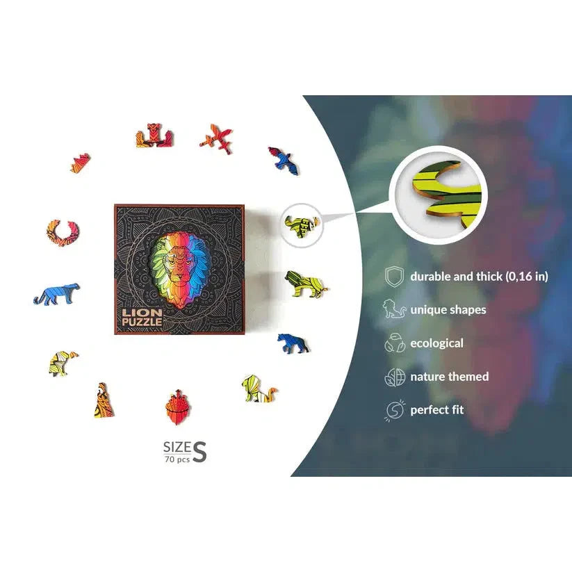 The Lion Shaped Jigsaw Piecezz Puzzle is a small, challenging puzzle that is perfect for noble leaders who are always up for a challenge and not afraid to take risks. The puzzle features 70 small, irregularly shaped pieces that are precision-cut from high-quality wood. The puzzle is shaped like a lion, making it a fun and educational puzzle for children and adults alike.