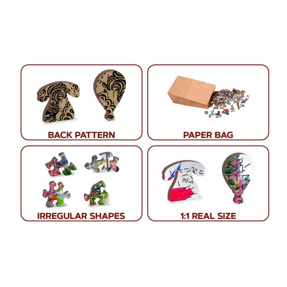 Each puzzle contains numerous unique shapes, characters, figures, and symbols that are cut seamlessly into the pattern. Think of these as mysterious little surprises each puzzle experience offers. These puzzles offer a high quality, rich beautiful image on the front and a detailed wallpaper style pattern on the back. Wooden City double-sided wooden puzzles offer a unique building experience that is sure to captivate puzzle enthusiasts of all ages.