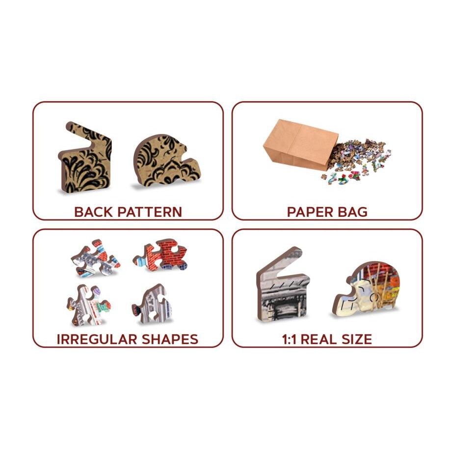 Each puzzle contains numerous unique shapes, characters, figures, and symbols that are cut seamlessly into the pattern. Think of these as mysterious little surprises each puzzle experience offers. These puzzles offer a high quality, rich beautiful image on the front and a detailed wallpaper style pattern on the back. Wooden City double-sided wooden puzzles offer a unique building experience that is sure to captivate puzzle enthusiasts of all ages.