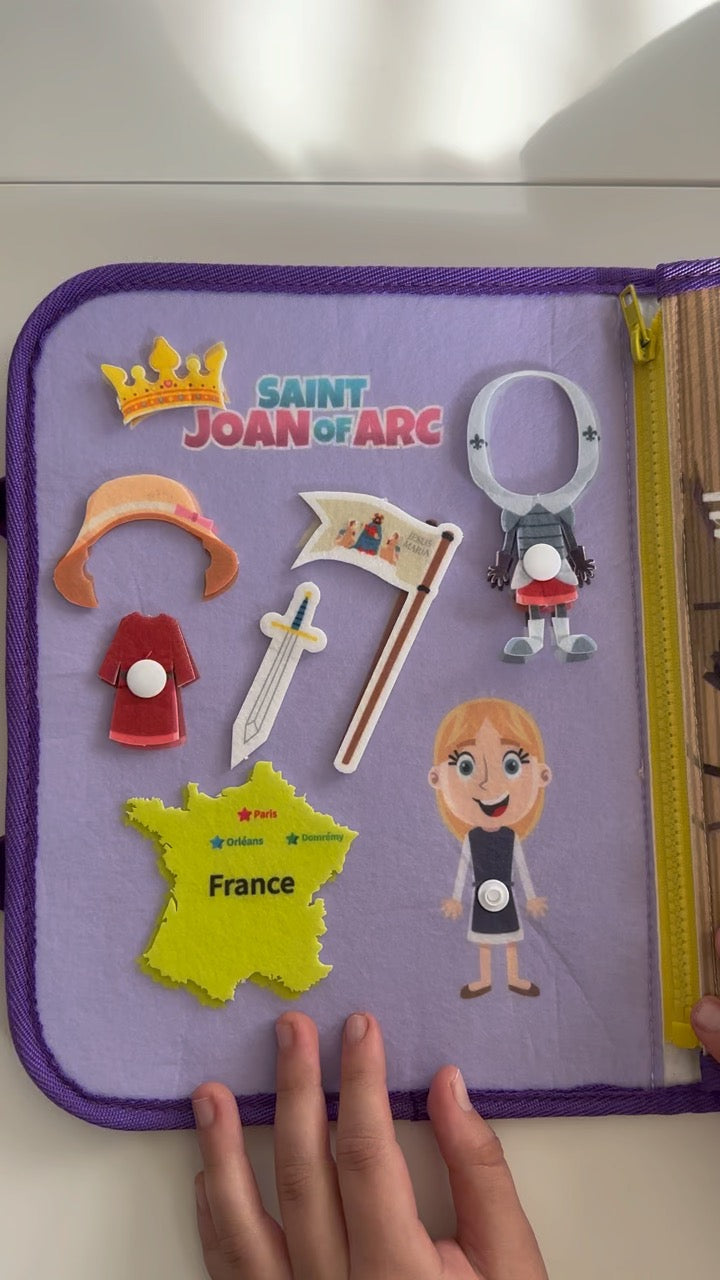 Introducing My Pray & Play Busy Book: God's Princesses — an interactive, quiet felt book that will introduce your little ones to the inspiring lives of two heroic, incredible female saints: St. Josephine Bakhita and St. Joan of Arc.