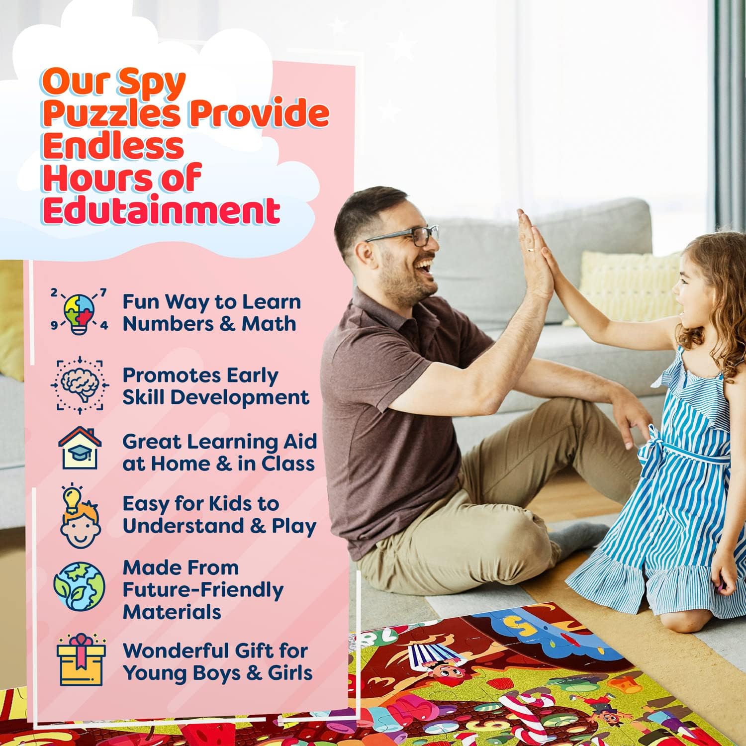 - Unique Spy Game That's as Easy as Pi for Kids to Learn: After your child assembles the jigsaw floor puzzle, they grab the magnifying glass to "spy" on numbers hidden throughout; Every time your child finds one, they need to find the flashcard with that number to learn all about it in a way that will help them retain the information
