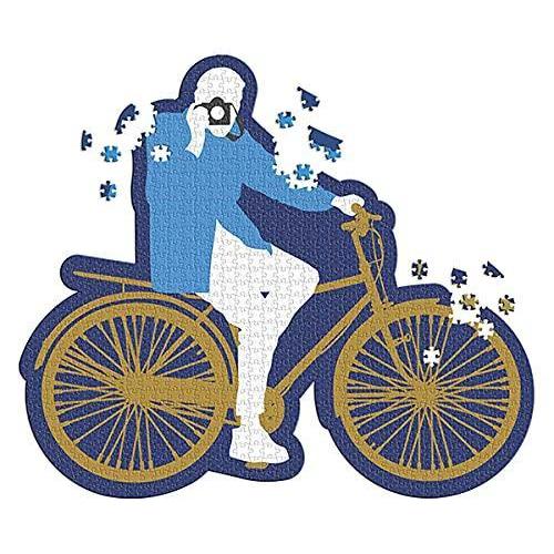 A delightful shaped puzzle capturing the iconic New York Times fashion photographer Bill Cunningham in his signature blue jacket, perched atop his trusty bicycle, with camera in hand.