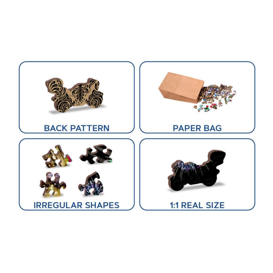 Each puzzle contains numerous unique shapes, characters, figures, and symbols that are cut seamlessly into the pattern. Think of these as mysterious little surprises each puzzle experience offers. These puzzles offer a high quality, rich beautiful image on the front and a detailed wallpaper style pattern on the back. Wooden City double-sided wooden puzzles offer a unique building experience that is sure to captivate puzzle enthusiasts of all ages.