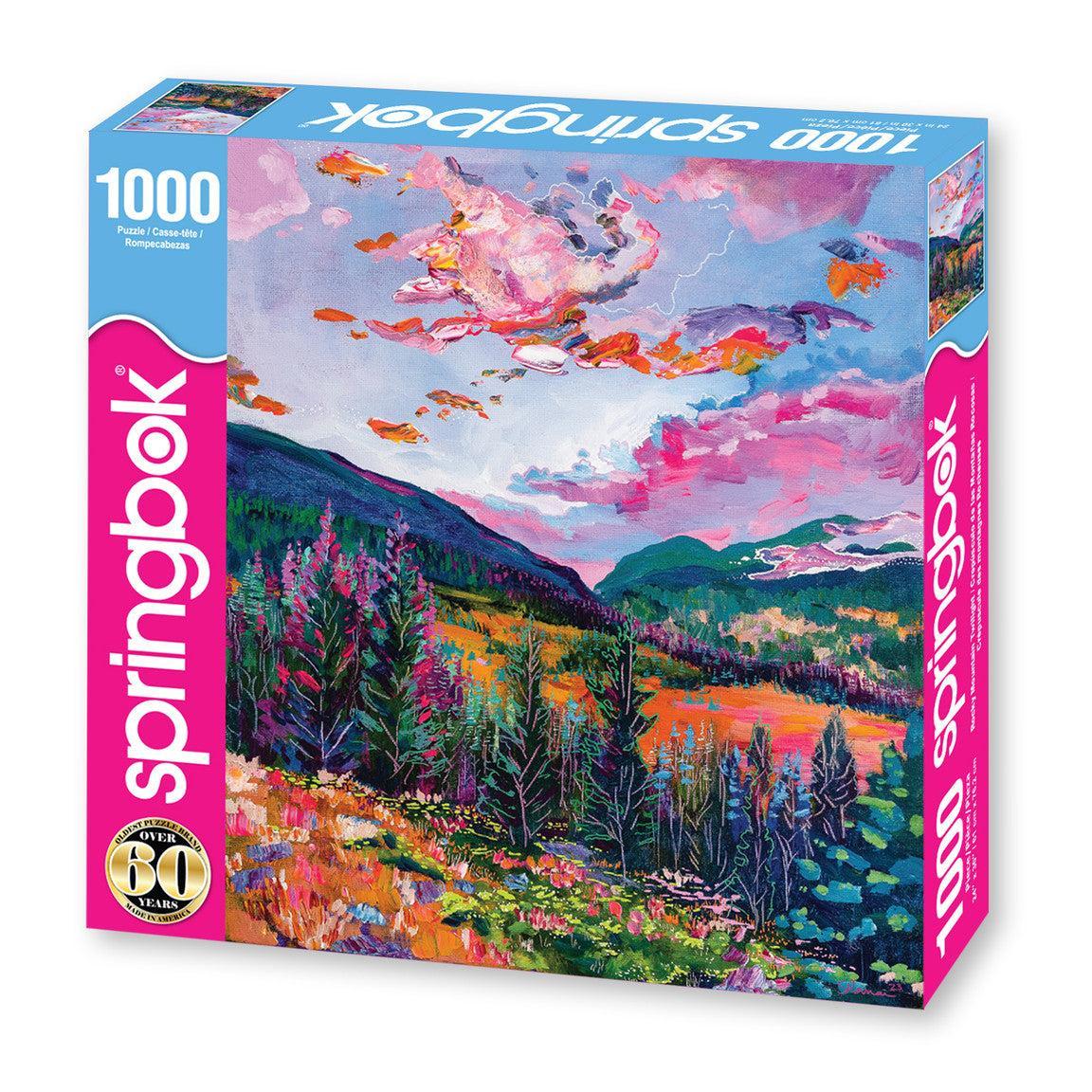 Immerse yourself in the vivid beauty of nature with this stunning 1000 piece jigsaw puzzle featuring a vibrant Rocky Mountain landscape by artist Shannon Roman. The scene is alive with bold, colorful brushstrokes depicting a majestic mountain range under a sky painted with shades of pink, purple, and orange. The lush greenery of the trees and the wildflowers in the foreground add to the rich tapestry of colors, creating a dynamic and uplifting visual experience. Perfect for puzzle enthusiasts who appreciate artistic landscapes, this puzzle offers a joyful and energizing challenge.