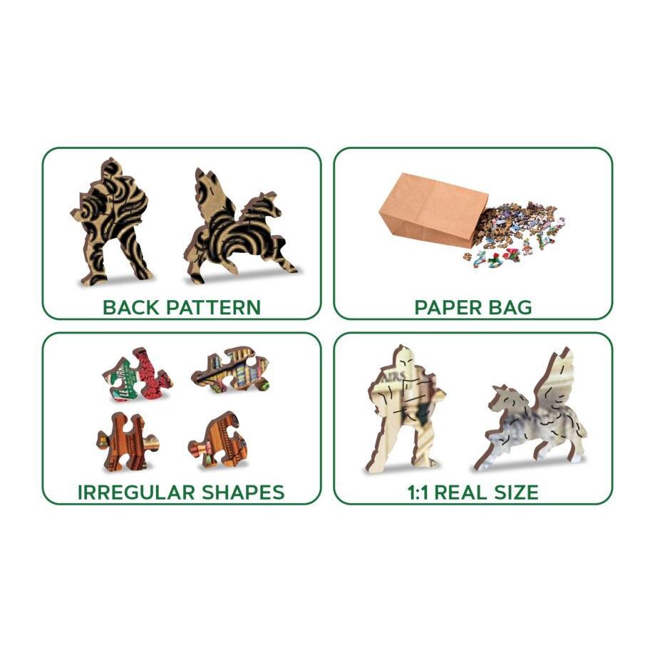 Each puzzle contains numerous unique shapes, characters, figures, and symbols that are cut seamlessly into the pattern. Think of these as mysterious little surprises each puzzle experience offers. These puzzles offer a high quality, rich beautiful image on the front and a detailed wallpaper style pattern on the back. Wooden City double-sided wooden puzzles offer a unique building experience that is sure to captivate puzzle enthusiasts of all ages.