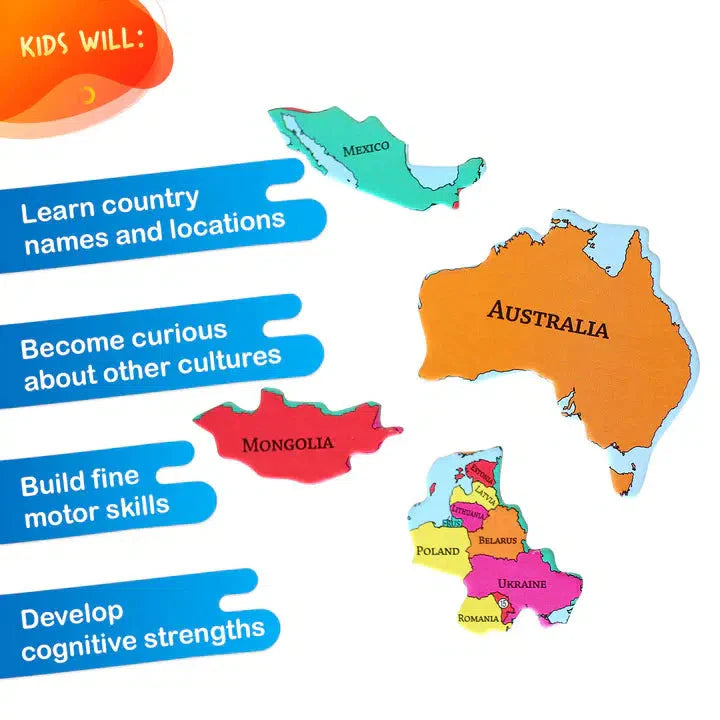 SKILL-BUILDING | Choosing and placing puzzle pieces builds fine motor skills. Kids have enhanced cognitive development as they try to solve the puzzle. Plus they learn and practice their vocabulary of different countries.